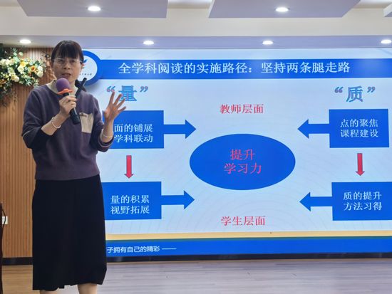 武平县实验小学正高级教师、特级教师从阅读教学切入,作了《“蜜蜂式”阅读视域下整本书阅读的实践探索》讲座。她以“蜜蜂采蜜”为喻,倡导“广涉猎、深汲取、勤酿制”的阅读模式,通过整本书阅读引导学生构建知识体系、提升思维品质。