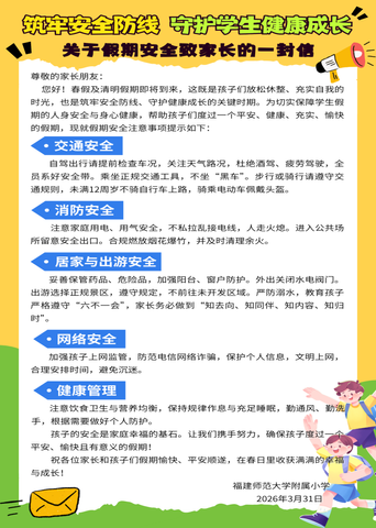 学校通过《致家长的一封信》、班级群通知等方式,及时向家长传递安全教育周活动内容,明确假期期间家长的监护责任,呼吁家庭与学校共同携手,为学生的安全成长保驾护航。家长们积极响应,表示将配合学校做好孩子的安全教育工作,形成了良好的家校共育氛围。